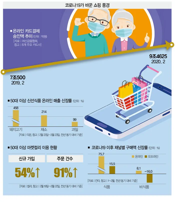소비 주체인 MZ세대(밀레니얼, Z세대)뿐만 아니라 베이비 붐 세대에 이르기까지 온 종일 스마트폰으로 생활하는 시간이 급격히 늘어나고 있습니다. 모바일 네이티브 세대인 MZ세대 뿐만 아니라 COVID 19의 영향으로 50대 이상인 베이비 붐 세대에서도 스마트폰 활용도가 매우 높아지고 있습니다. 최근 이커머스 업체인 마켓컬리가 발표한 자료에 따르면 2월 19일~3월 22일 50대 이상의 신규 가입자 수는 전년 동기대비 54%가 증가했으며, 주문건수도 90%가 증가했습니다.